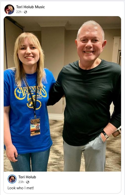 Photos below are from Tori Holub's Facebook page (https://www.facebook.com/toriholubmusic/) after being invited to sing at Acoustic Night at the Carpenters 55th Anniversary Celebration in Downey, California this past weekend (25 April 2024).